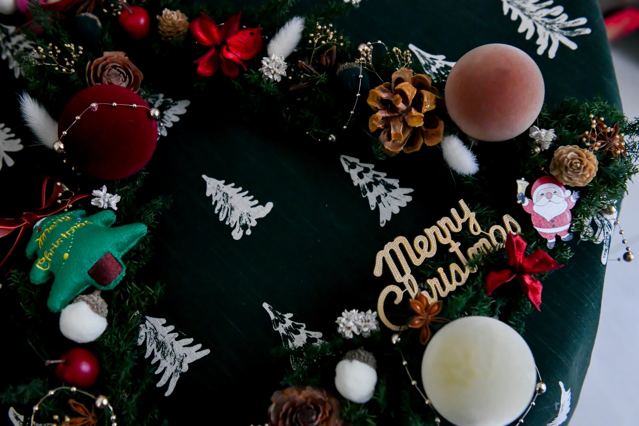 以柔霧色植絨裝飾圓球與毛茸茸異材質果實小巧點綴其中,