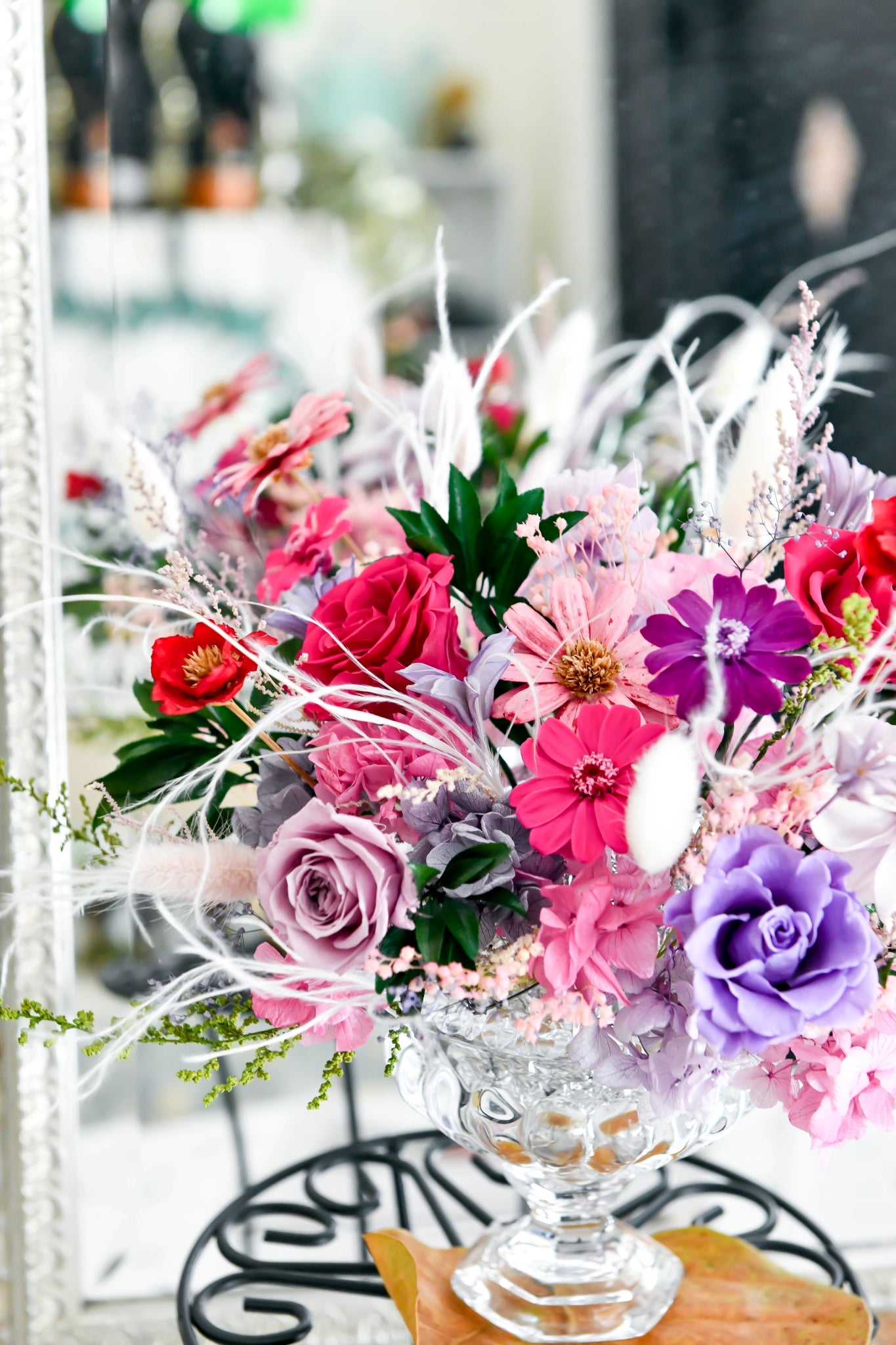 部分角度會保留玫瑰花莖以鐵絲加工之處,不做刻意遮掩以維持整體和諧感
